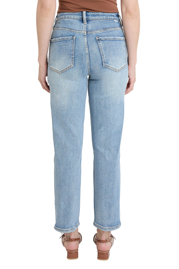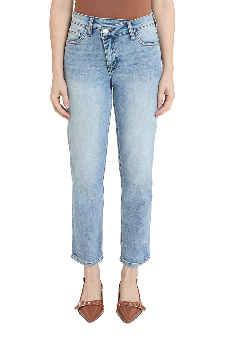 Dylan Mid Rise Asymmetric Cropped Straight Leg Jean features a unique asymmetric waistband and a sleek, straight fit, these jeans are designed to flatter and shape. The built-in tummy control panels provide a smooth and sculpted look. The asymmetrical detail at the waist adds an unexpected edge, making these jeans perfect for those who want to make a statement while enjoying all-day comfort. Crafted from premium fabric with just the right amount of stretch, these jeans move with you and retain their shape, providing both flexibility and lasting wear.