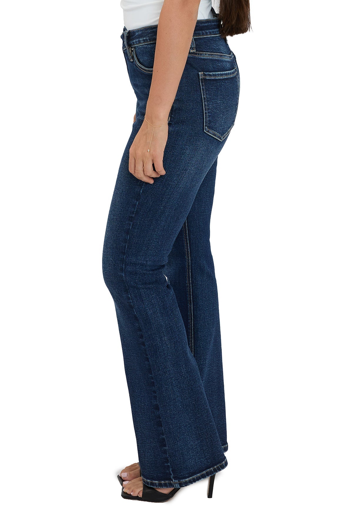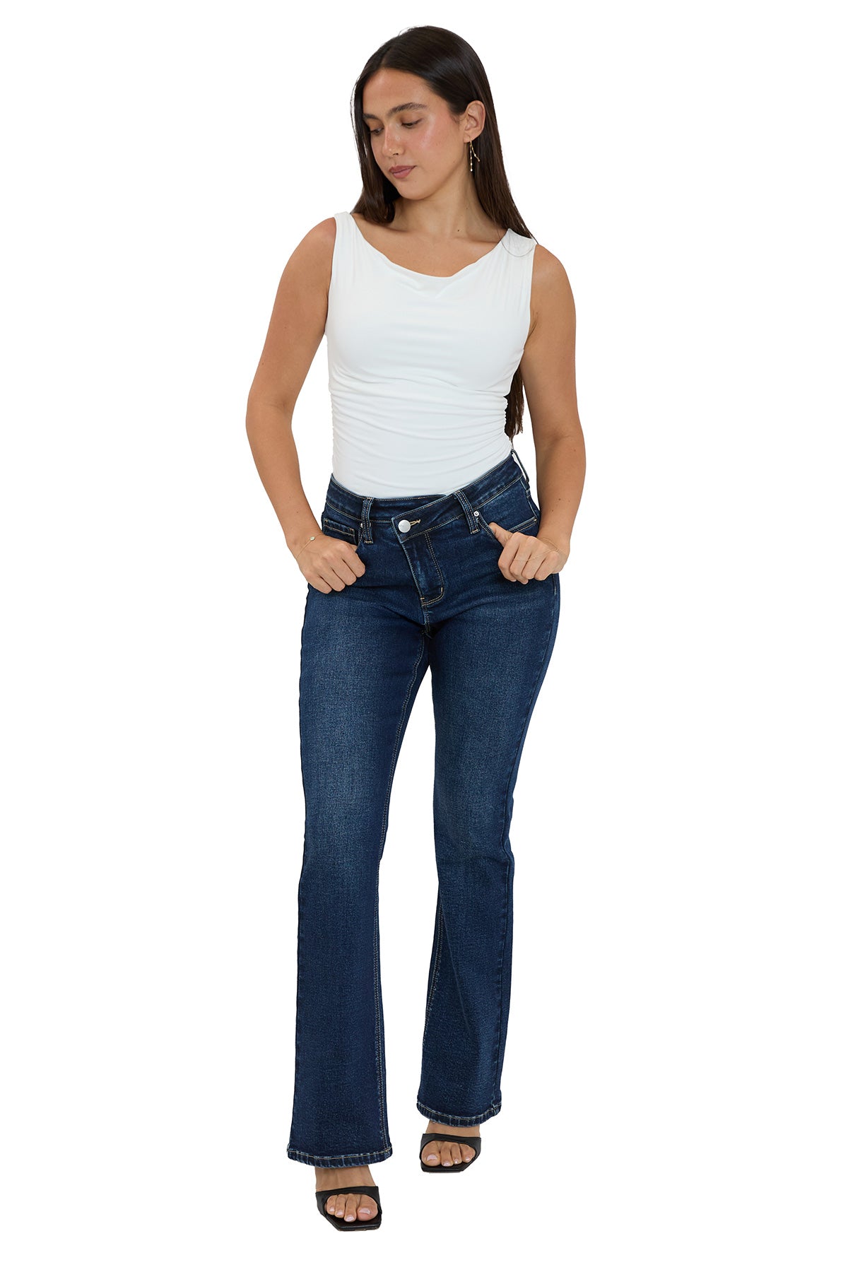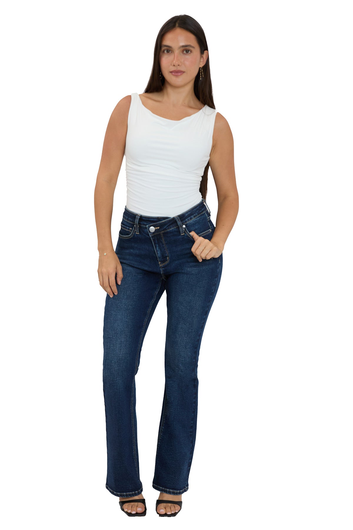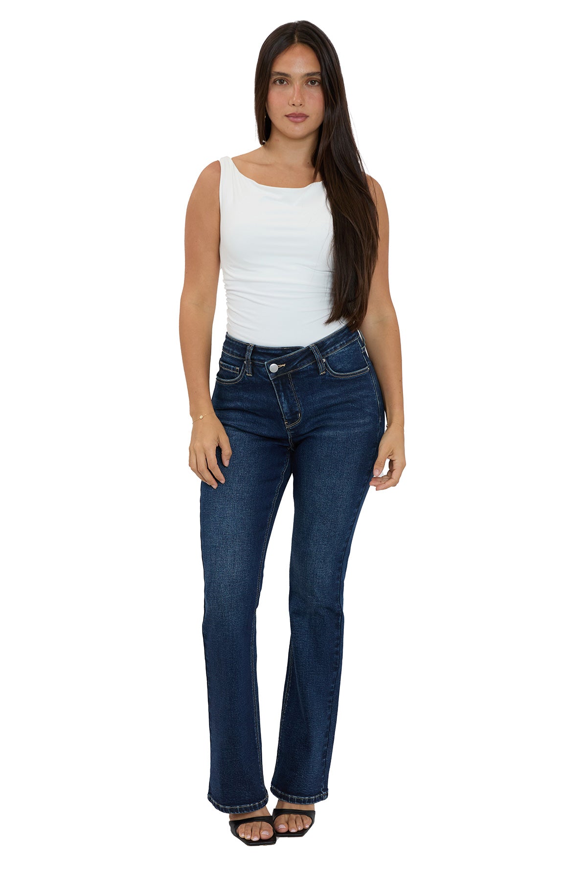 The Mia High Rise Crossover Bootcut Jeans redefine classic denim with a modern twist. Designed to sit high on the waist, they offer a flattering, contoured fit through the hips before gently flaring at the hem for a sleek, elongated look. A subtle asymmetrical button and zipper fly adds a contemporary edge to this essential.